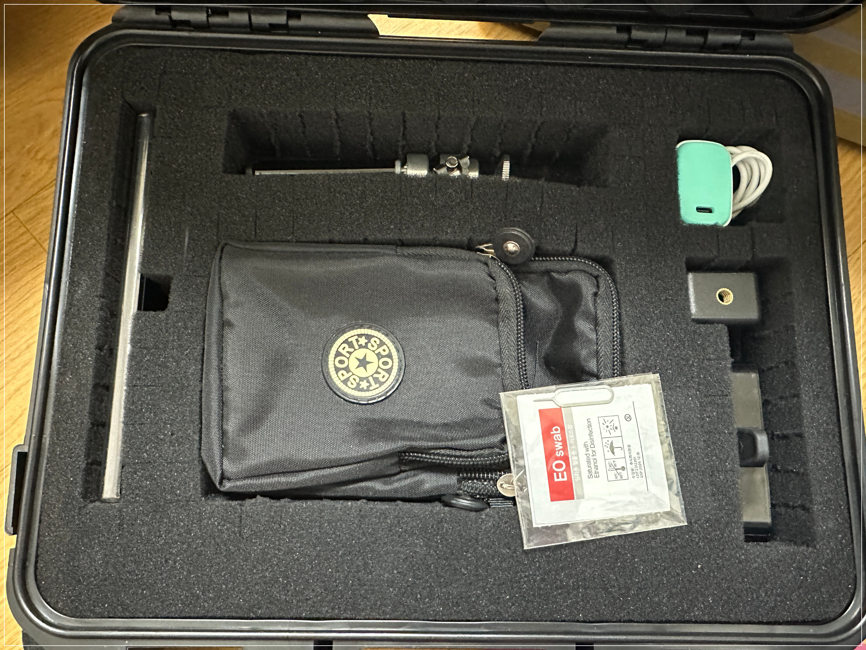 핸드폰 넣을 수 있는 미니백 , 미니삼각대 , 보조배터리 와 , 거치대 , 충전기 , 알콜클리너 까지!