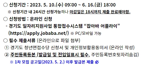 지원대상은 취업 활동을 하는 경기도 내 18세 이상 만 39세 이하 청년이다. 주 30시간 미만 일자리 응시한 면접도 신청이 가능하다. 희망하는 지역의 경기도 지역화폐로 지급되며 최대 50만 원 까지다. 또한 사는 거주지 주소가 주민등록상 경기도어야 하고 2023년 1월 1일 이후 취업을 위해 면접에 응한 청년들이 신청하면 된다. 경기도외 지역 소재 기업이나 해외기업 면접도 신청하능 하고 현재 취업한 사람인지, 아닌지와는 상관없다고 한다. 신청 예외는 다음과 같다. 실업급여를 받고 있는 청년, 경기여성취업지원금에 참여 중인 사람 , 경기도에 주관한 공무원 취업 면접에 응시한 사람, 청년면접수당과 유사한 사업에 참여중인 사람이다. 면접이라고 다 같은 면접이 아니다. 가족이 대표로 있는 사업장에 응시한 경우, 취업이 아닌 교육이나 취업훈련 과정에 참가하기 위해 응시한 면접, 취업이 아닌 면접의 대가로 돈을 받는 면접 , 면접이 아닌 역량 검사에 참여한 경우다