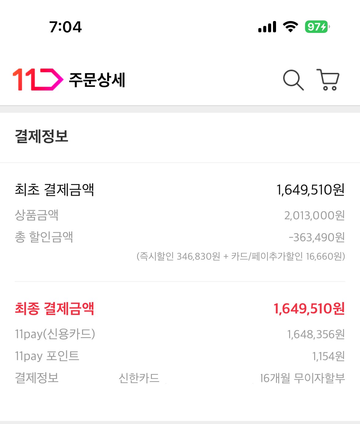저는 실제로 11번가 신한카드로 16,660원을 추가로 할인 받았고