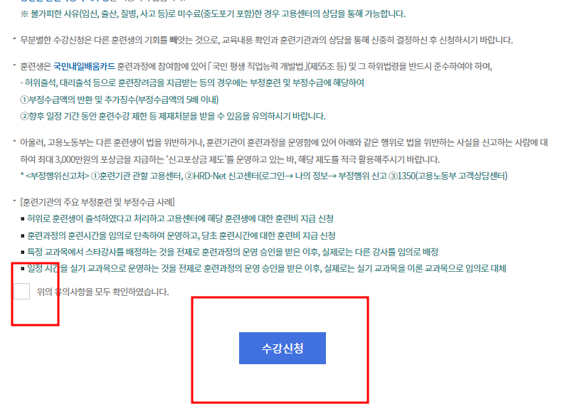 4. 사항을 잘 읽어보고 체크 표시를 한 뒤 수강신청을 마치면 됩니다. 별다른 문제없다면 수강신청이 완료되었다고