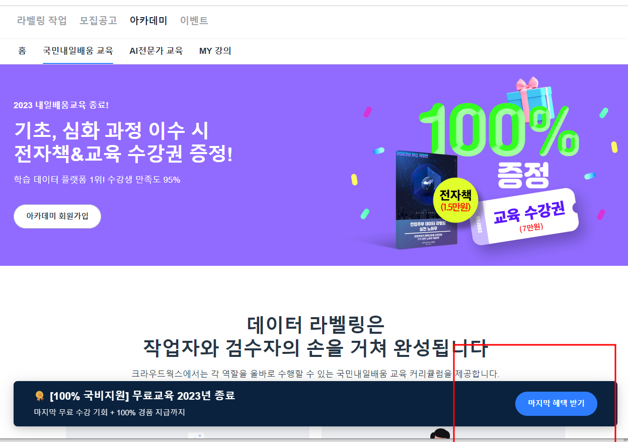 6. 아래에 보시면 무료 교육 안내가 나오면서 혜택 받기 있습니다 눌러서 들어가 주세요