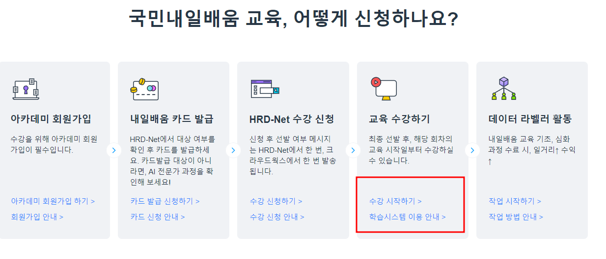 내일배움카드를 신청 후 발급이 완료되었다면 꼭 수령하지 않더라도 수강신청이 가능합니다 데이터라벨링을 배울 수 있는 곳은 많지만 100% 교육비 지원을 받아서 할수 있는 곳은 크라우드웍스 란 곳입니다 온라인 수업으로 진행 되기 때문에 별도로 이동할 필요도 없고 집에서 컴퓨터만 있으면 누구든 언제나 들을 수 있습니다