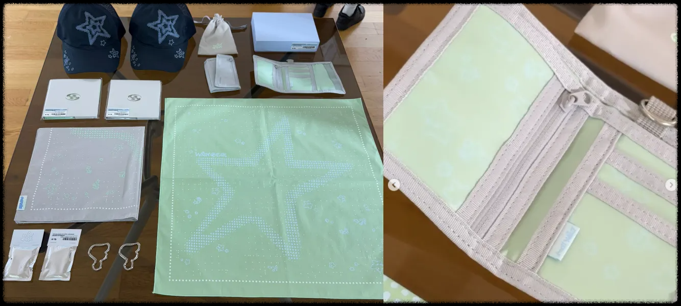 이번 협업 제품군은 산산기어의 간결한 디자인에 NCT WISH 특유의 밝고 신선한 이미지가 더해져 팬들의 시선을 사로잡았습니다. 액세서리부터 의류, 문구류까지 다양하게 선보였는데, 특히 카라비너, 반다나, 지갑, 크로스백이 큰 인기를 끌었습니다. 저는 반다나와 지갑을 직접 구매했는데, 실물을 받아보니 사진보다 훨씬 고급스러웠습니다. 반다나는 기본적인 그레이와 엔시티를 상징하는 듯한 네온그린 두 가지 색상이 있었는데, 개인적으로는 네온그린 컬러가 확실히 매력적이었습니다.