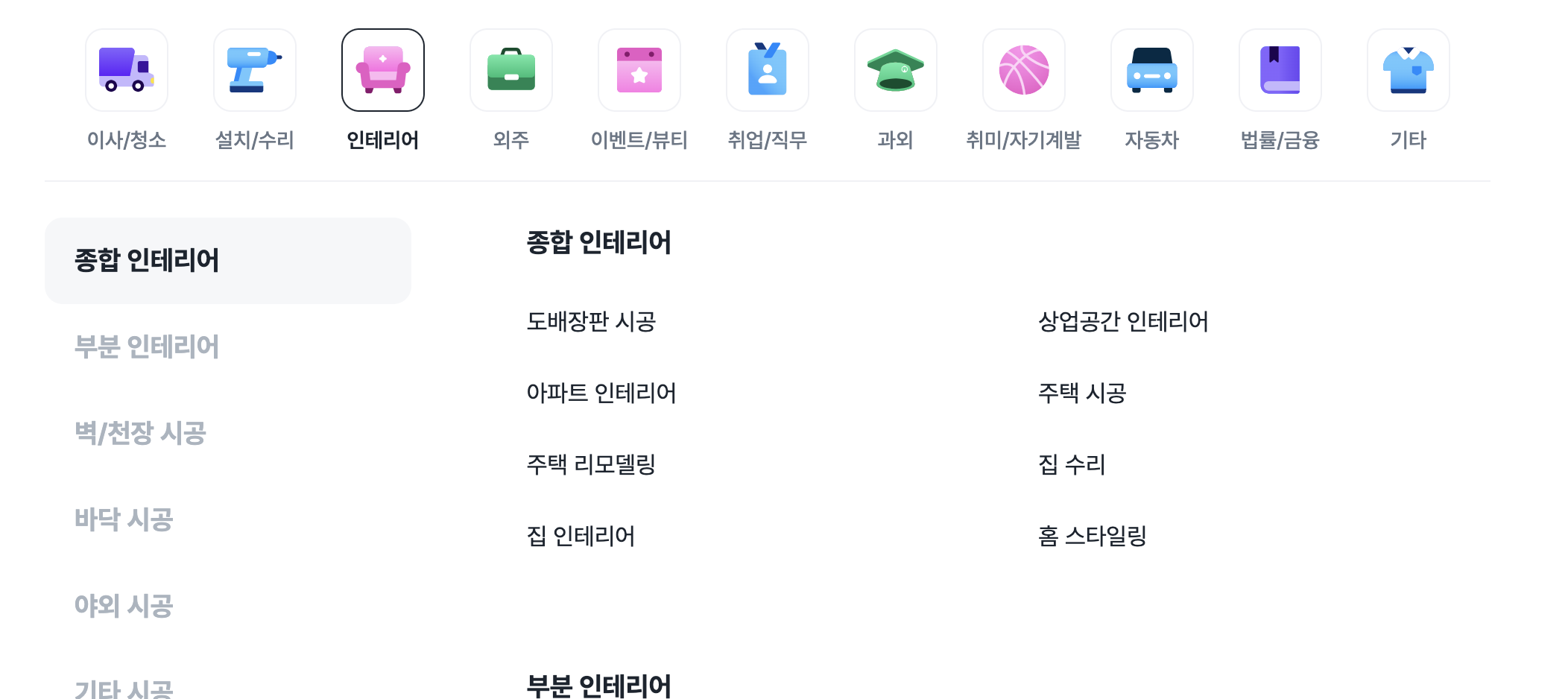 저는 인테리어 서비스를 신청했지만, 주로 과외 (국영수 , 예체능 , 댄스등 ) 청소 , 이사 , 에어컨 설치 청소 서비스