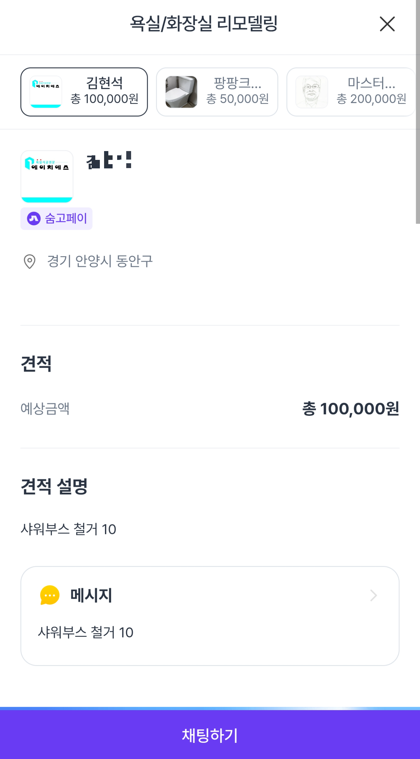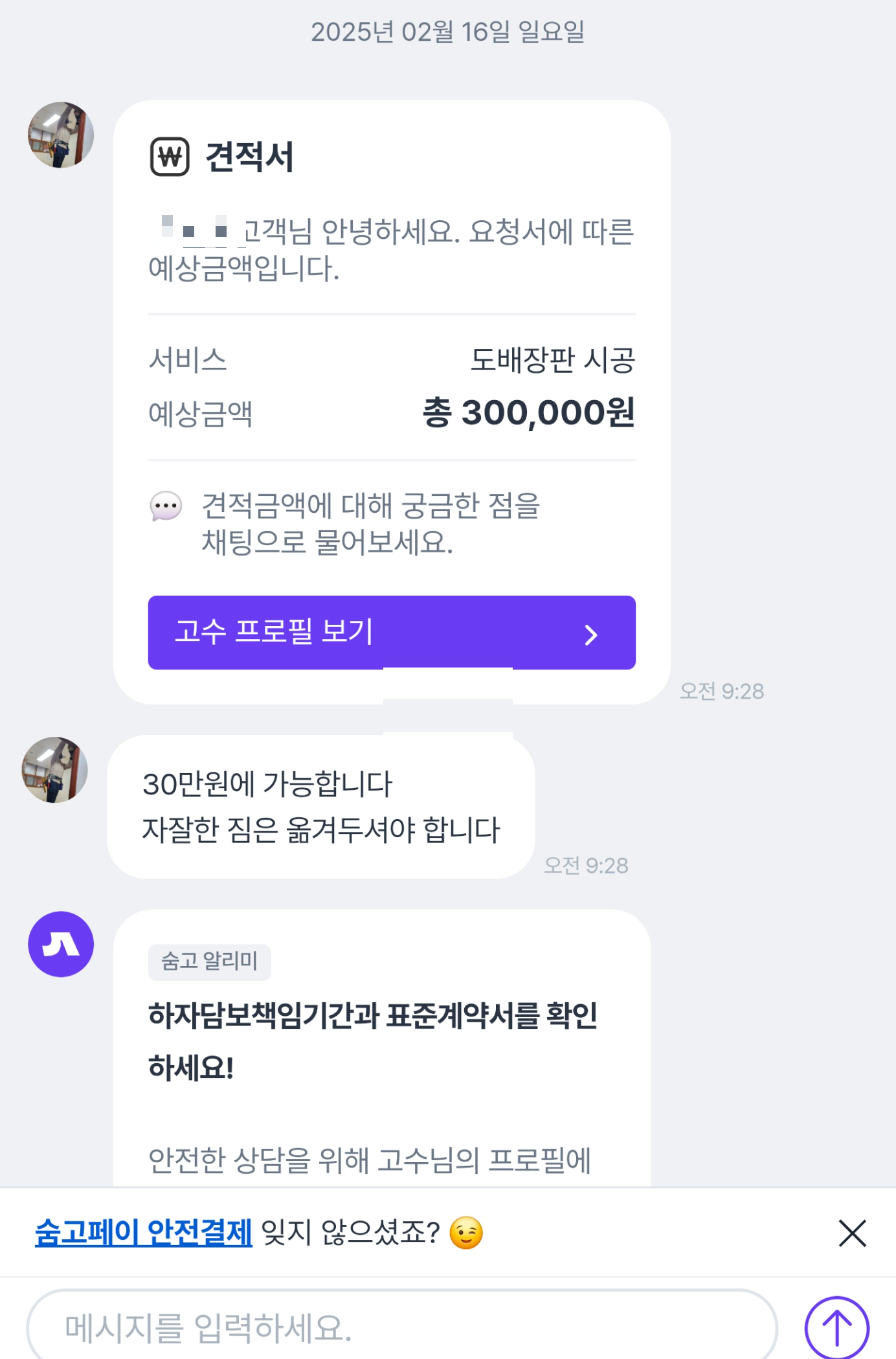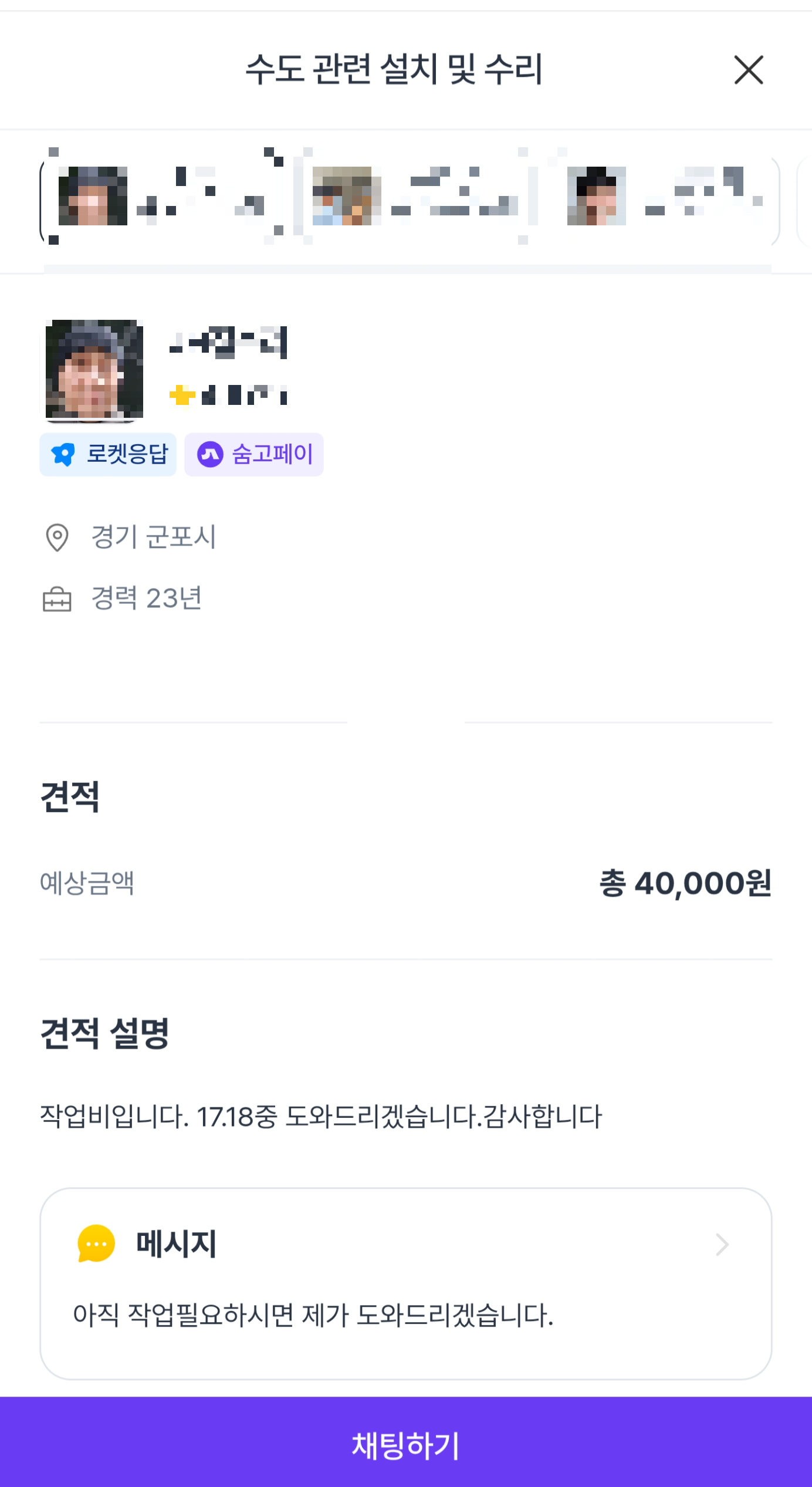 적당한 가격의 고수님과 연결되어 간단한 채팅을 하고 날짜를 잡아서 예약을 하게 되었습니다