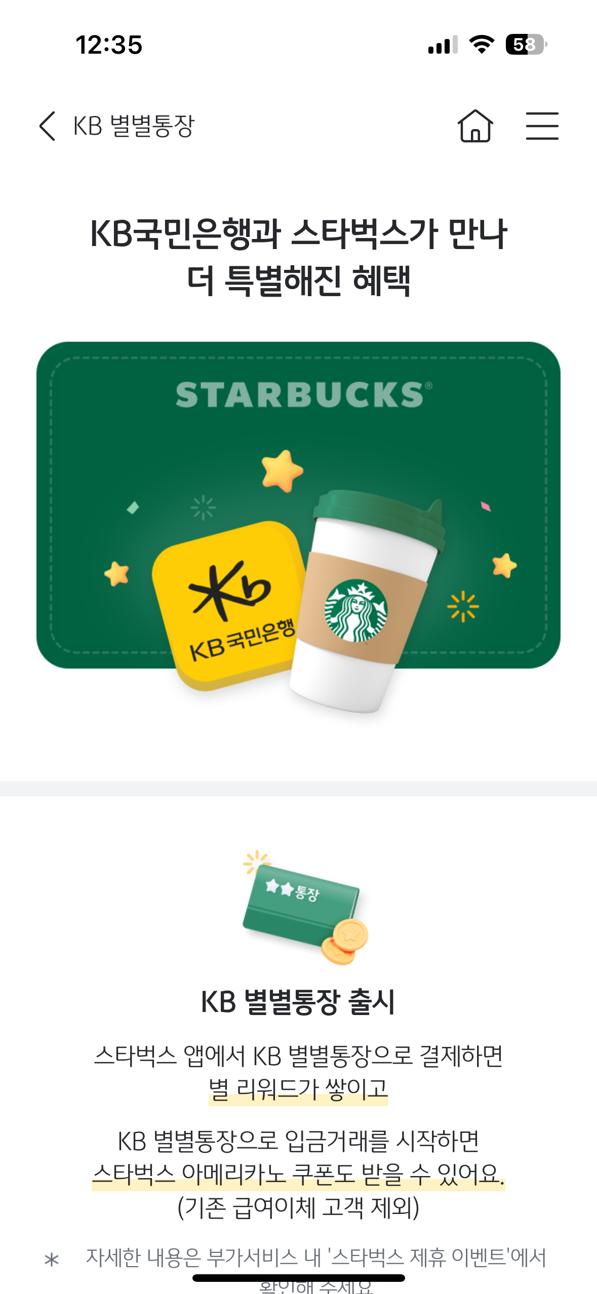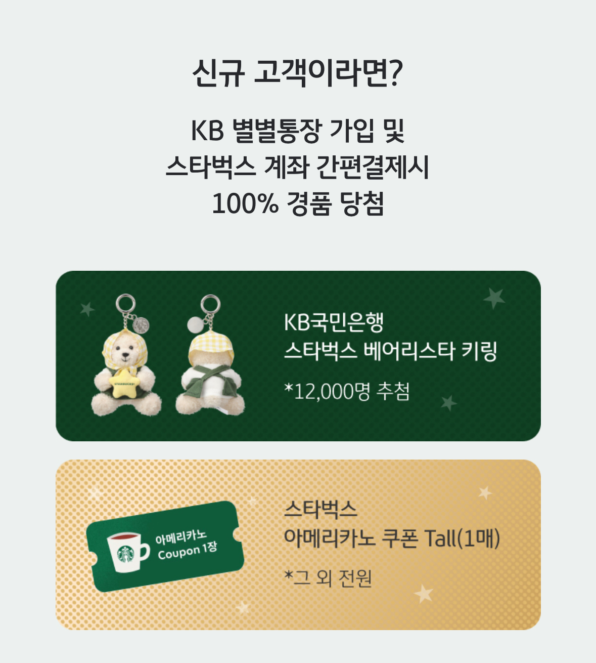 스타벅스 어플 내에 간편계좌시스템 메뉴에 국민은행 계좌를 등록하시면 아메쿠폰을 드립니다
