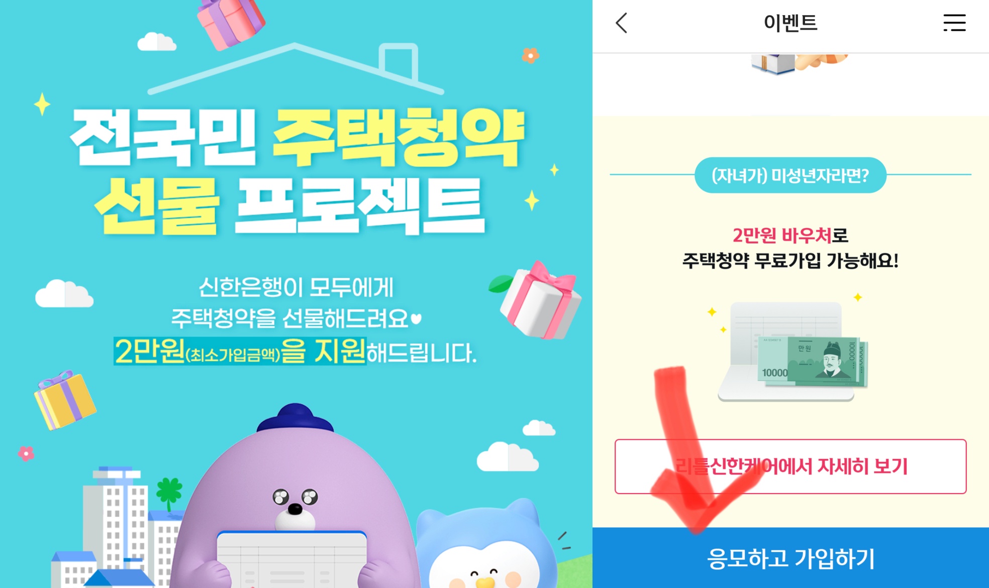 이벤트 페이지에서 '응모하고 가입하기'를 눌러서 가입을 한다. 최소 가입 금액은 2만 원 이상이다 청약통장은 매달 10만 원씩 입금하는 것을 추천한다 청약 통장은 주택을 위해 적립하는 통장으로 만기해지라는 개념이 없고 , 납부한 기간만큼 청약 시 가산점을 주기 때문에 일정 금액을 오랫동안 적립 하는 것이 중요하다 만약에 피치 못할 사정으로 해지하고 다시 가입 시 그동안 납부했던 기간은 말소되기 때문에 가능하면 해지하지 않아야 하며 , 정말 신중하게 결정해야 한다 연말정산 시 청약 통장으로 소득공제가 가능하다
