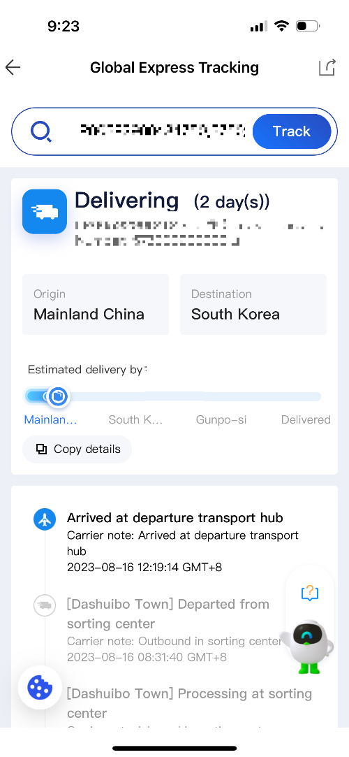 눌러주게 되면 날짜별로 내 상품이 어디에서 어디로 이동 중인지가 자세히 나옵니다 영어로 나오지만 스마트폰으로 보신다면 바로 번역기능이 작동해서 되기 때문에 읽는 것에는 어려움이 없으실 겁니다 만약 자동 번역이 되지 않더라도 대략적으로 상품이 이동하는지는 확인하실 수 있습니다 한국인의 후기가 많고 믿을만한 상품을 구매하셨다면 안전하게 5~7일 내에는 배송이 되오니 조금만 기다려보시길 바랍니다