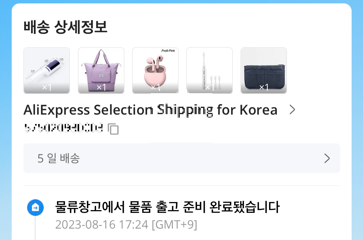 밑에 '배송 상세정보'에 보시면 더 자세한 경로를 알 수 있는 숫자로 된 배송 송장 번호가 있습니다 영어로 AliExpress~korea라고 적혀있는 글씨 옆 '>' 화살표 표시를 눌러주세요
