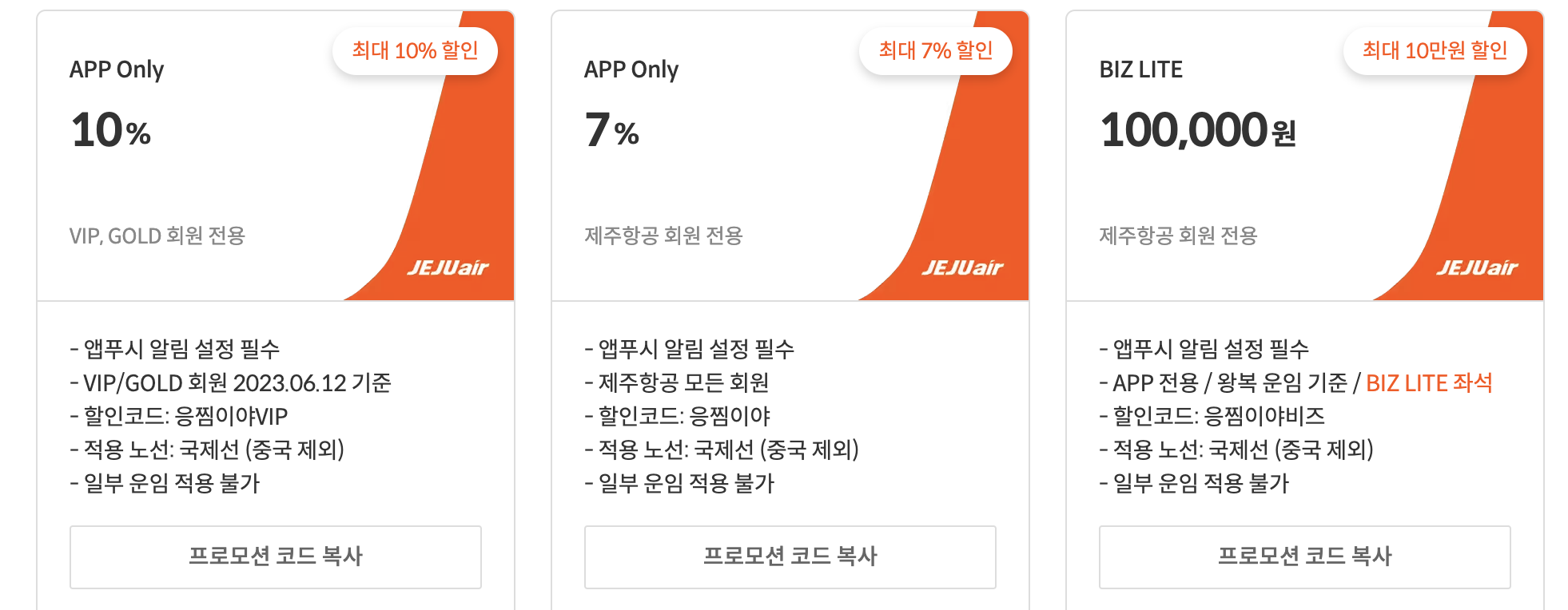 예매전 할인받는 방법이 있습니다 제주항공 어플을 다운로드하여 프로모션 할인 코드를 하여 사용하는 것인데요 제주항공 앱을 다운로드하여 가입한 신규회원에게는 최대 7%의 할인이 있습니다 제주항공 VIP 나 GOLD 회원은 국제선에 10% 최대 할인을 , 일반 회원들은 최대 7% 할인과 비즈라이트 좌석을 예매한 고객들에겐 최대 10만 원 할인을 제공합니다