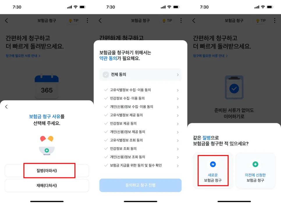 같은질병으로 보험 청구 하느냐? 란 물음에는 '새로운 보험금 청구' 를 하시면 됩니다