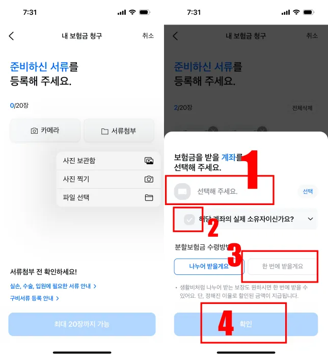 실제 내 계좌 가 맞는지 체크를 해주세요 , 그리고 보험금을 나누어서 받을지 , 한꺼번에 받을지를 선택할 수 있습니다