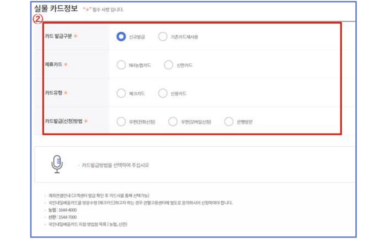 그리고 가장 중요한 카드 발급을 어떻게 할 것인지를 신청하면 되는데요 , 우편으로 받는 방법이 있는데 신청은 2가지 방법으로 할 수 있어요