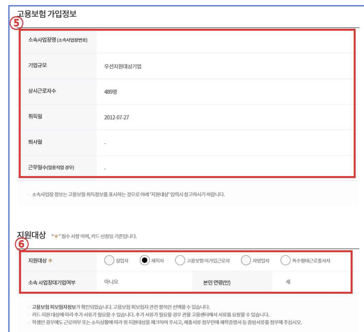4대 보험에 가입 중인 재직자 라면 고용보험 가입정보가 회사 이름과 함께 열람이 가능합니다 확인 후 밑에 '재직자'에 표시해주시면 됩니다