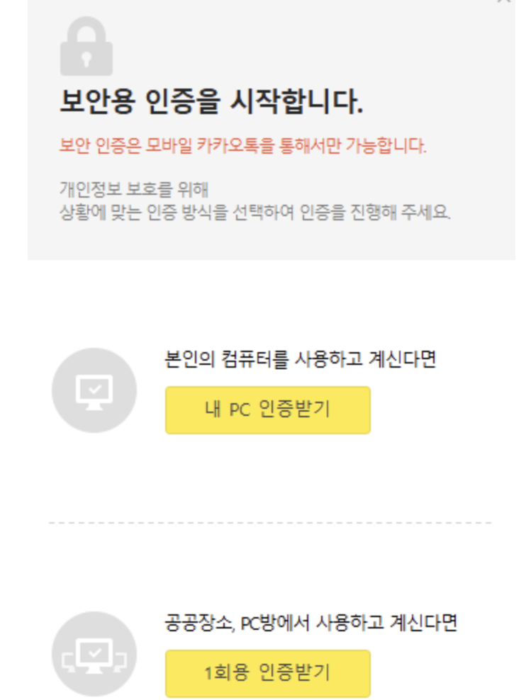 '내 PC인증받기'를 눌러서 스마트폰 카카오톡에 있는 인증을 받아서 접속을 하게 되면 나중에 로그아웃 후 다시 로그인을 해도