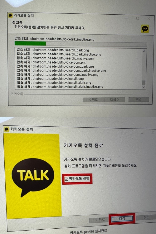 마침을 누름과 동시에 카카오톡이 실행이 되는 것이고 체크를 풀어주면 나중에 내가 원할때 실행을 하면 됩니다
