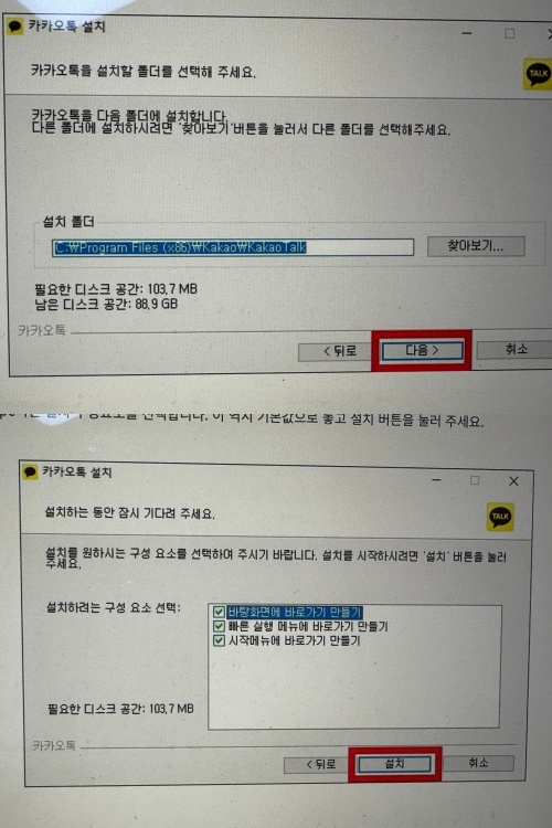 그냥 '다음' 을 눌러주시고 다음 화면에선 바탕화면에 카카오톡 아이콘을 설치할 곳을 선택하라고 하는데 잘 아시는 분들은 골라서 하시면 되지만 잘 모르시겠다면 그냥 '설치'를 눌러주세요 그래도 상관없습니다 설치 안되고 그런 건 아닙니다