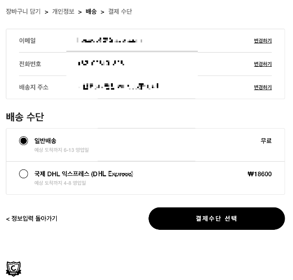 케이스티파이의 배송은 두 가지 종류가 있습니다 첫 번째는 일반배송, 두 번째는 국제 DHL 익스프레스입니다