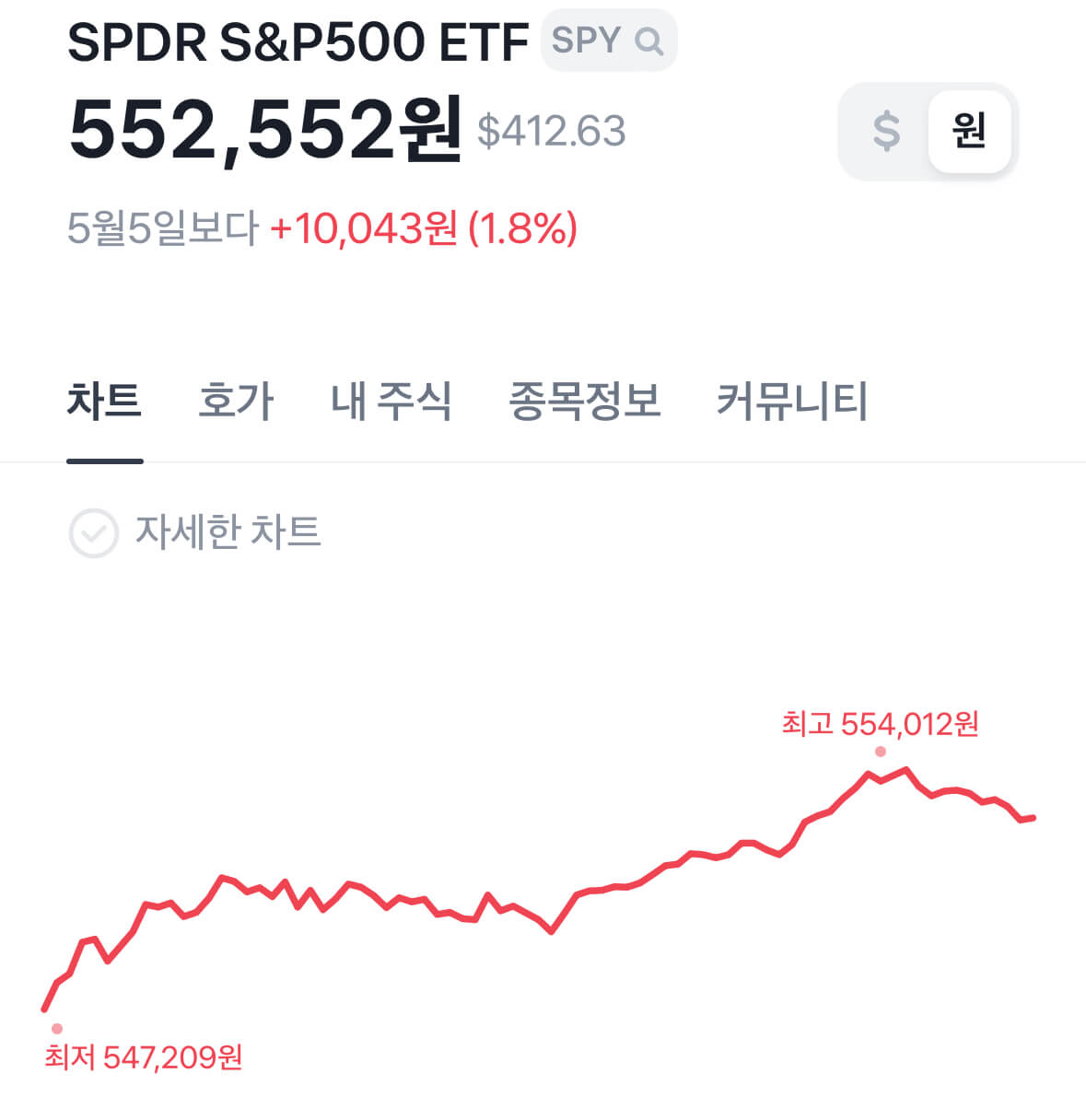 SPY ETF의 현재 주가는 글을 작성하고 있는 2023년 5월 첫째 주를 기점으로 5월 5일 보다 오른 412.63 달러로 마감한 상태이다 한화로 환산하면 55만 원이 조금 넘는 금액이다 코로나로 인해 영향을 많이 받던 SPY ETF는 1년 전보다는 약 1,700원이 올랐으며 5년 전보다는 약 한화로 189,737원 정도가 오른 상태이다. %로 계산하면 50%가 넘는 수익률을 보여주는 대형 상품이 아닐 수 없다. 1일 최고가는 413달러까지 올라갔었으며 최저가는 408달러이다. 1일 거래량은 약 0.8억 주 가 되며 운용자산은 495조 원 정도 된다 시가총액은 501조 원으로 탄탄한 규모를 자랑하는 상품이다. 미국 주식 시장이 다시 경기 회복의 기대와 무너지던 기업들이 슬슬 실적의 호조를 내기 시작하면서 조금씩 상승세를 타고 있는 시점이다. 우량주나 대기업들이 실적이 좋아지니 당연히 S&P지수도 같이 오르고 투자 손실을 봤던 금액도 다시 원래대로 돌아가고 있다. 전 세계 투자자들이 다시 한번 이 상품에 주목을 하는 이유도 이것이다. 주가가 오르고 있고 오른다는 것은 수익을 볼 수 있다는 희망적인 메시지 이기 때문에 하지만 모든 투자는 위험이 따르기 때문에 리스크를 최대한 줄여야 하고 자신의 투자 금액과 목표를 잘 설정하여 신중한 투자를 해야 한다. 전문가나 많은 서적을 통해 공부를 한 후 투자할 것을 조언한다.