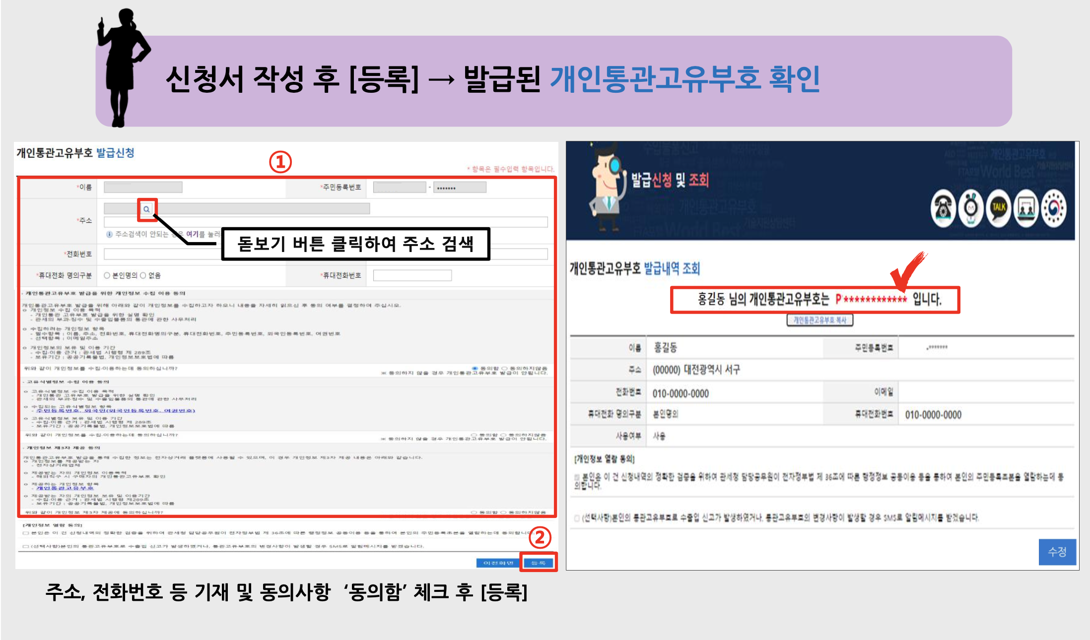 이름, 주민등록번호, 주소, 전화번호, 휴대폰번호를 작성하고 , '동의함'에 체크하면 바로 나의 개인통관고유부호가 발급 됩니다