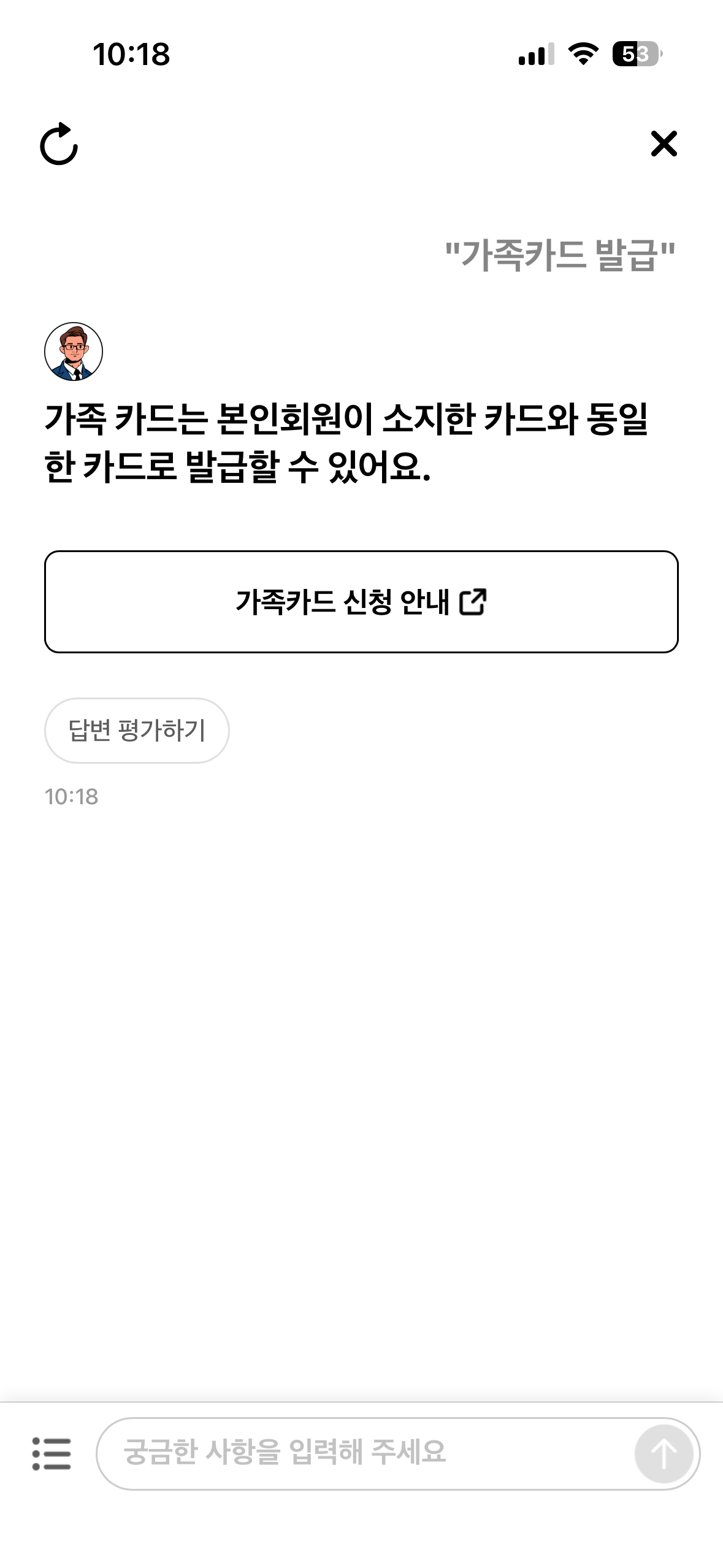 현대카드 가족카드 발급은 다음 절차로 진행됩니다: 현대카드 앱 또는 홈페이지 로그인 을 해도 디지만 저는 챗봇을 선택했고