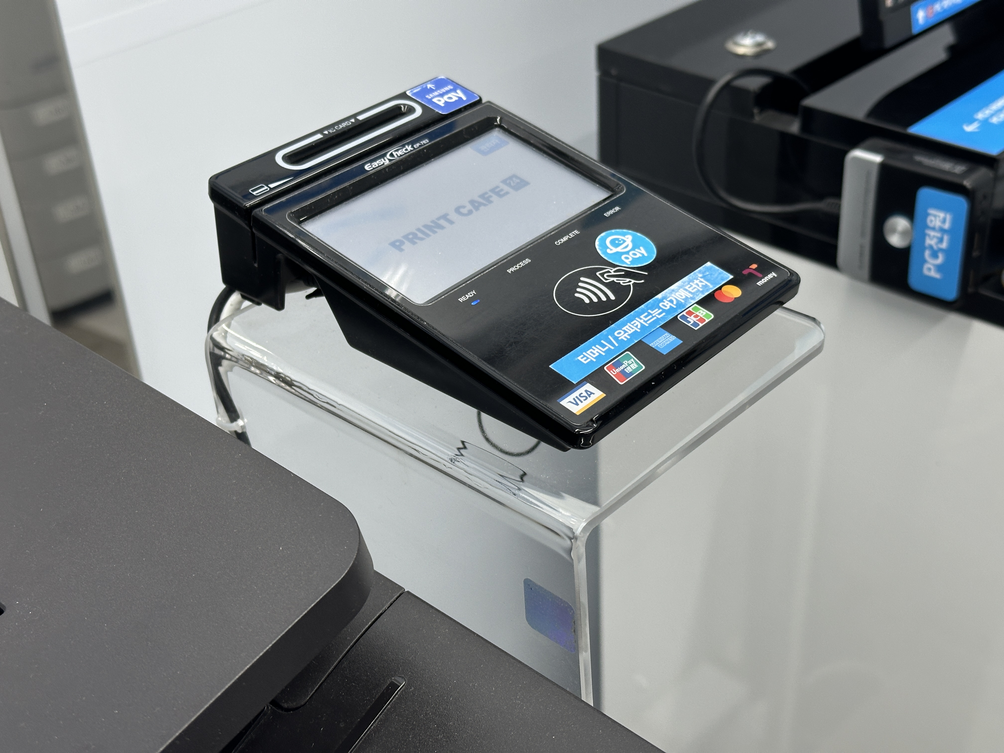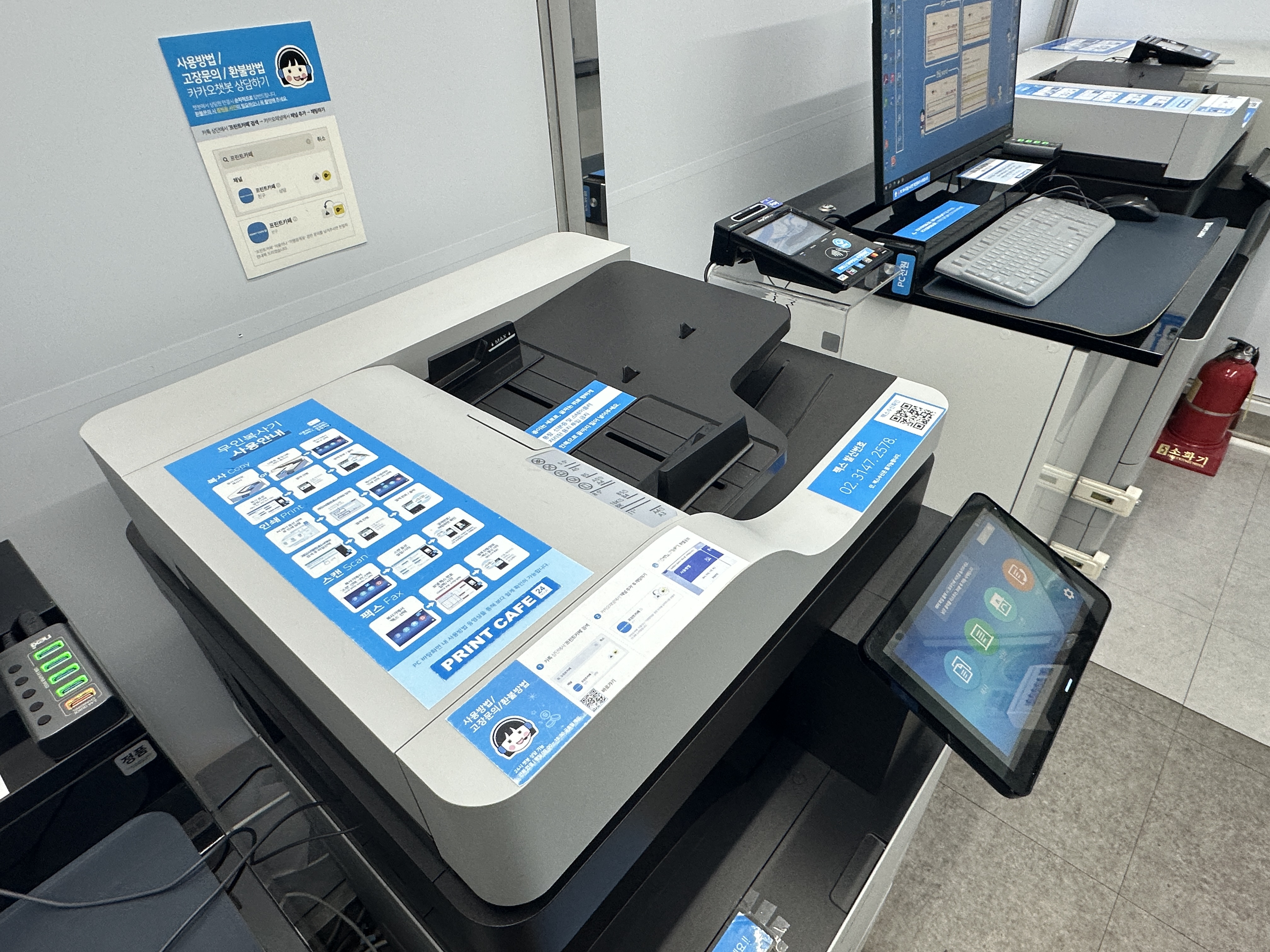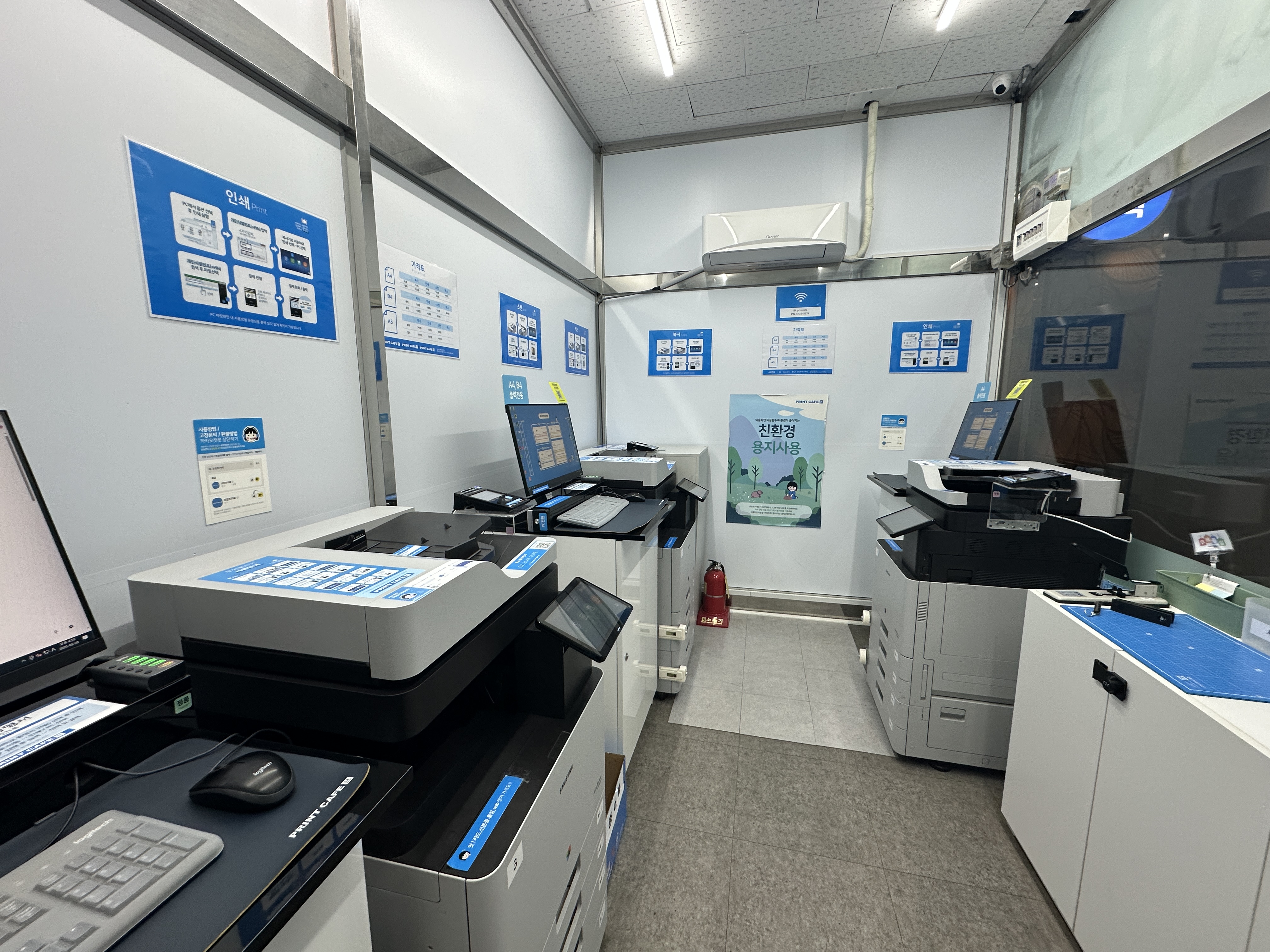 내부는 셀프 키오스크와 프린터, 그리고 제본기기 등이 체계적으로 배치되어 있었습니다.
